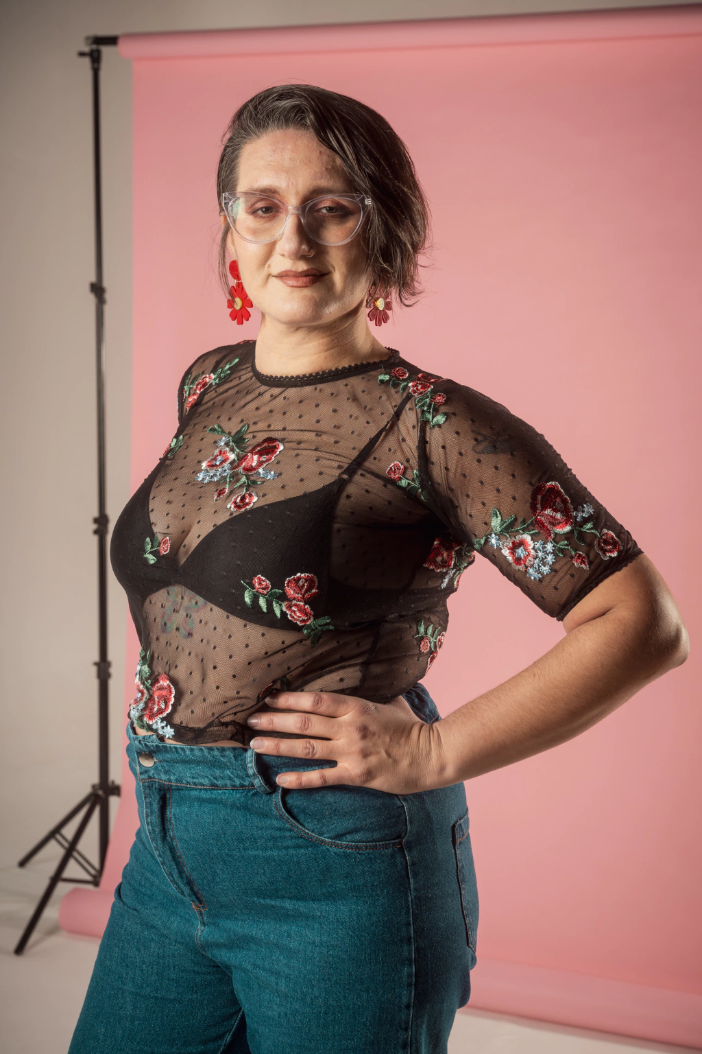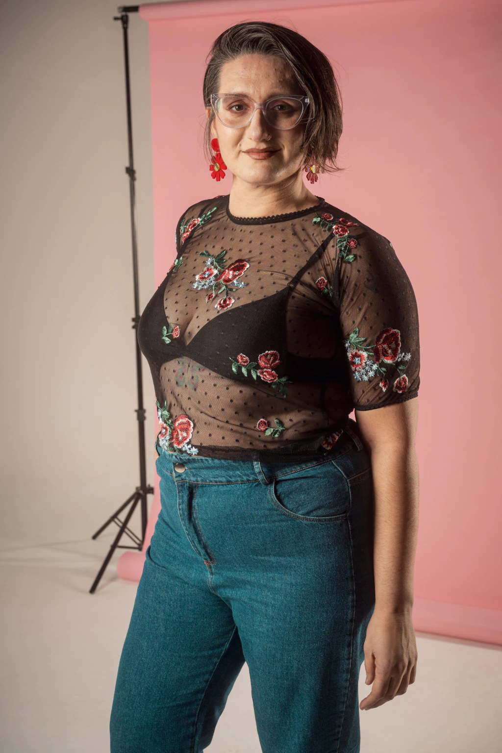Blusita manga corta confeccionada en microtul bordado 92% nylon 8% spandex