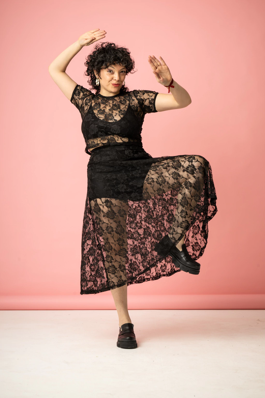 Blusita manga corta confeccionada en encaje negro 92% nylon 8% spandex