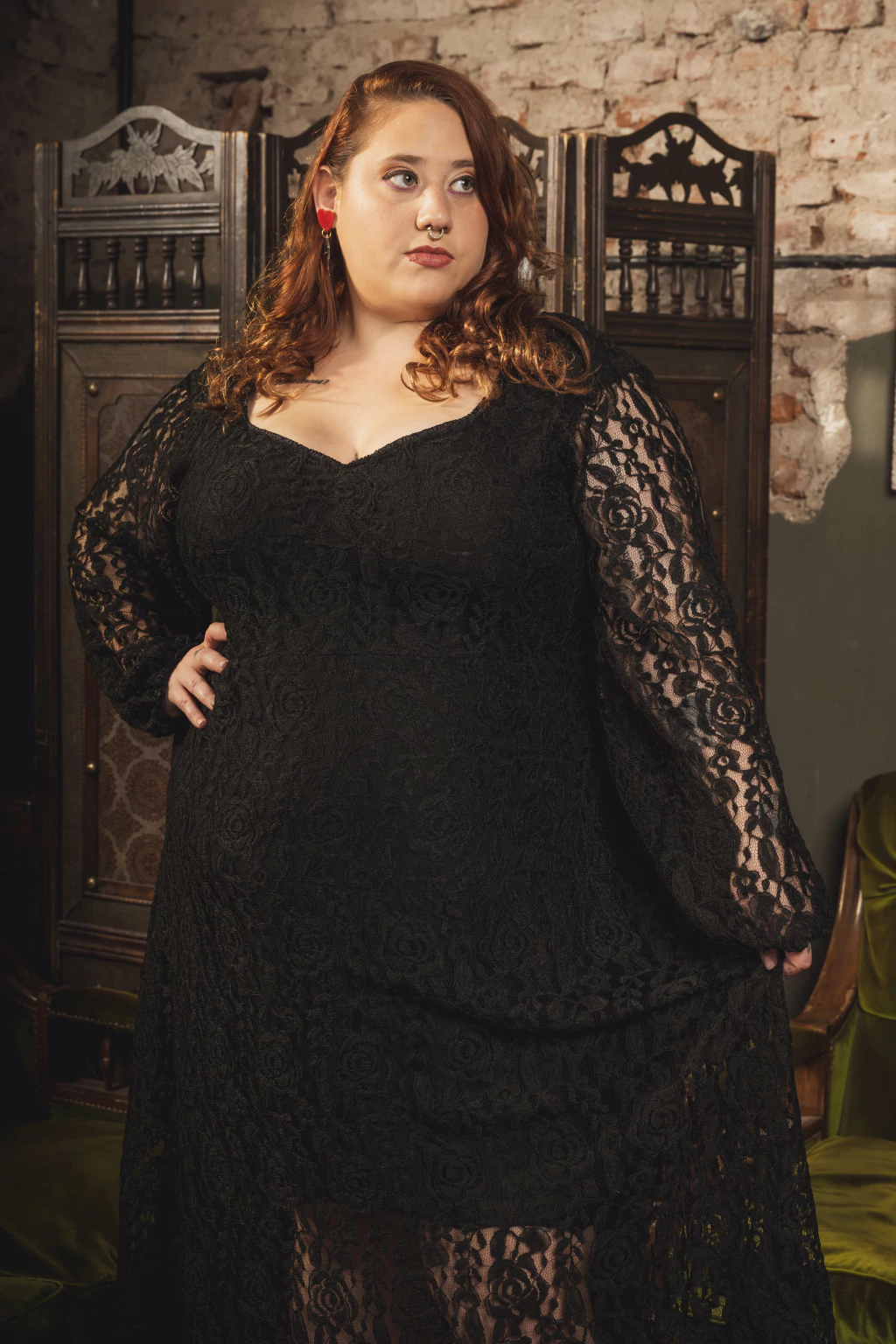 Vestido manga con manga bombe y escote corazon confeccionado en encaje negro 92% nylon 8% spandex, con forreria en modal con lycra gamuzado, super suave.